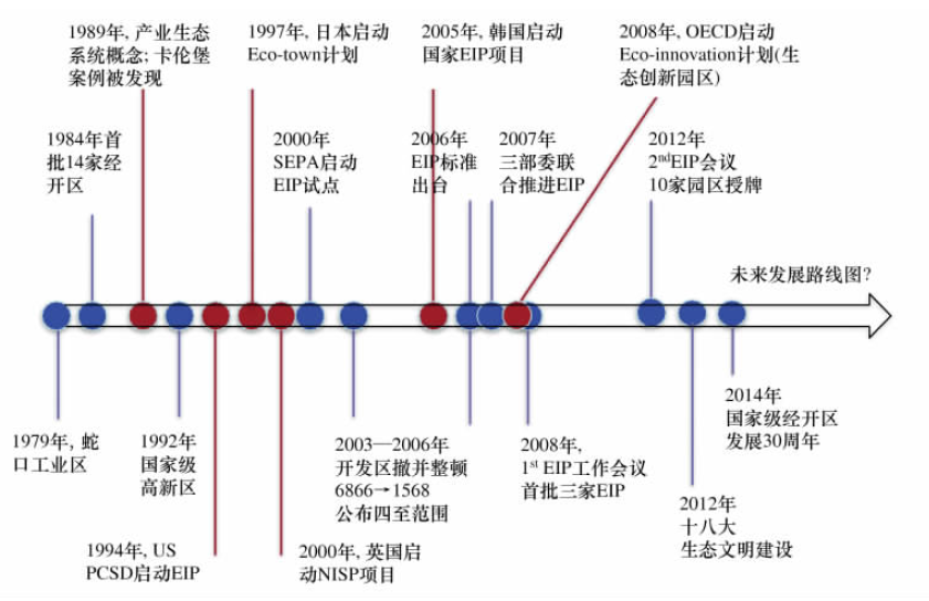 生態(tài)工業(yè)園區(qū)是產(chǎn)業(yè)生態(tài)學(xué)研究和實(shí)踐的重要載體之一。工業(yè)園區(qū)這一人工經(jīng)濟(jì)系統(tǒng)在發(fā)展中有意識(shí)地模仿自然生態(tài)系統(tǒng),應(yīng)用系統(tǒng)工程的理論和方法,對(duì)現(xiàn)有園區(qū)進(jìn)行重新規(guī)劃、設(shè)計(jì)和建設(shè),以提高資源、能源利用效率,減少污染物產(chǎn)生和排放,改善環(huán)境質(zhì)量,促進(jìn)經(jīng)濟(jì)持續(xù)發(fā)展。2000年以來(lái),歐美國(guó)家、澳大利亞、日本、韓國(guó)、新加坡、印度、巴西等國(guó)家都出現(xiàn)了一系列關(guān)于生態(tài)工業(yè)園區(qū)案例的實(shí)證分析。工業(yè)發(fā)達(dá)國(guó)家生態(tài)工業(yè)園區(qū)發(fā)展的代表性例子包括丹麥、美國(guó)、英國(guó)、日本和韓國(guó),下圖為幾個(gè)主要國(guó)家及中國(guó)推進(jìn)生態(tài)工業(yè)園區(qū)發(fā)展的演變概覽。發(fā)達(dá)國(guó)家現(xiàn)階段關(guān)于生態(tài)工業(yè)園區(qū)發(fā)展的重點(diǎn)問題主要集中在以下方面:(1)生態(tài)化發(fā)展的驅(qū)動(dòng)力,包括園區(qū)建立物質(zhì)、能量、信息、廢棄物等集成系統(tǒng)過程中潛在干系方之間建立合作聯(lián)系的驅(qū)動(dòng)力;(2)生態(tài)化發(fā)展準(zhǔn)則,目的是定義并識(shí)別推動(dòng)生態(tài)化發(fā)展的創(chuàng)新行動(dòng)(3)生態(tài)化發(fā)展成功要素,目的是從政治、經(jīng)濟(jì)、社會(huì)和環(huán)境識(shí)別各園區(qū)生態(tài)創(chuàng)新的成功要素;(4)定義針對(duì)推動(dòng)園區(qū)生態(tài)創(chuàng)新有效發(fā)展和管理的關(guān)鍵問題。