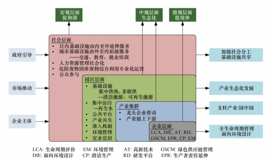 我國(guó)實(shí)施可持續(xù)發(fā)展戰(zhàn)略要求發(fā)展生態(tài)工業(yè),打破“綠色壁壘”也需要工業(yè)的生態(tài)化發(fā)展,可以說,生態(tài)工業(yè)是我國(guó)工業(yè)發(fā)展的必然選擇。生態(tài)工業(yè)理念被引入中國(guó)后,原國(guó)家環(huán)??偩钟?000年開始推動(dòng)生態(tài)工業(yè)園區(qū)建設(shè),發(fā)展過程中逐步形成了“有標(biāo)準(zhǔn)可依,依標(biāo)準(zhǔn)建設(shè),據(jù)標(biāo)準(zhǔn)考核,示范試點(diǎn)帶動(dòng),建立長(zhǎng)效機(jī)制”的發(fā)展路線圖。鑒于開發(fā)區(qū)面臨的嚴(yán)峻環(huán)境保護(hù)形勢(shì),國(guó)家稅收政策調(diào)整、資源和能源緊缺、環(huán)保標(biāo)準(zhǔn)提高等伴隨的發(fā)展壓力,以及節(jié)能減排科技需求,2007年環(huán)保部、商務(wù)部、科技部聯(lián)合,加強(qiáng)對(duì)國(guó)家生態(tài)工業(yè)示范園區(qū)建設(shè)的推進(jìn)。生態(tài)工業(yè)示范園區(qū)是依據(jù)清潔生產(chǎn)要求、循環(huán)經(jīng)濟(jì)理念和工業(yè)生態(tài)學(xué)原理而設(shè)計(jì)建立的一種新型工業(yè)園區(qū)。它通過物流或能流傳遞等方式把不同工廠或企業(yè)連接起來(lái),形成共享資源和互換副產(chǎn)品的產(chǎn)業(yè)共生組合,使一家工廠的廢棄物或副產(chǎn)品成為另一家工廠的原料或能源,模擬自然系統(tǒng),在產(chǎn)業(yè)系統(tǒng)中建立“生產(chǎn)者—消費(fèi)者—分解者”的循環(huán)途徑,尋求物質(zhì)閉環(huán)循環(huán)、能量多級(jí)利用和廢物產(chǎn)生最小化。
