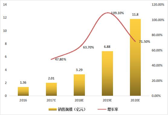 根據(jù)艾媒咨詢數(shù)據(jù)顯示,2016年中國(guó)智能音箱銷售規(guī)模為1.36億元,預(yù)計(jì)2017年將突破兩億,達(dá)到2.01億,增長(zhǎng)率為47.8%;預(yù)計(jì)到2020年,智能音箱銷售規(guī)模將超過(guò)10億元。目前雖眾多廠商已推出智能音箱產(chǎn)品,但市場(chǎng)總體銷售規(guī)模仍處于較低水平,隨著產(chǎn)品進(jìn)一步優(yōu)化升級(jí)及智能家居的推廣,中國(guó)智能音箱消費(fèi)市場(chǎng)潛力將得到釋放,行業(yè)有望迎來(lái)爆發(fā)式增長(zhǎng)。