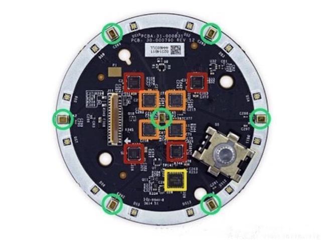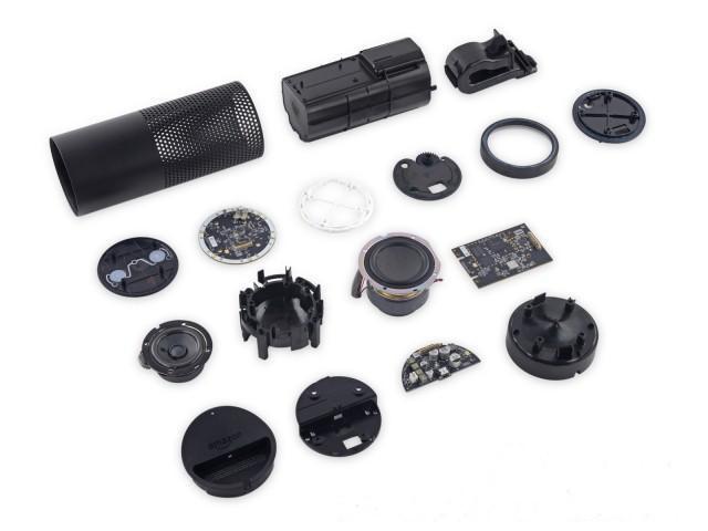 下圖展示了 Echo 拆解后的部件。可以看到,智能音箱的硬件并不算復(fù)雜(相對(duì)于無(wú)人駕駛等“重型”AI 產(chǎn)品)。