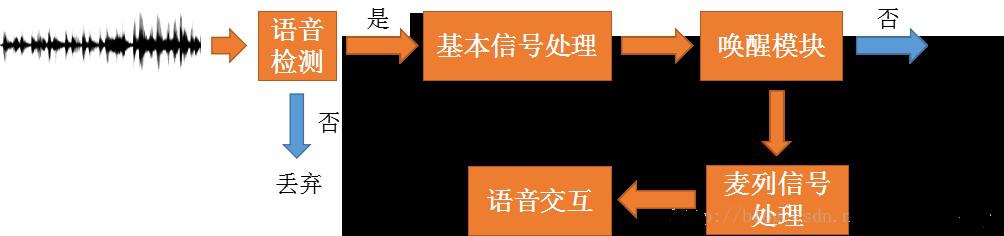 總體而言,音箱工作時(shí),麥列始終處于拾音狀態(tài)(持續(xù)對(duì)聲音信號(hào)進(jìn)行采樣、量化)。經(jīng)過(guò)基本的信號(hào)處理(靜音檢測(cè)、降噪等),喚醒模塊會(huì)判斷是否出現(xiàn)喚醒詞。如果出現(xiàn)喚醒詞,后續(xù)語(yǔ)音會(huì)進(jìn)行更復(fù)雜的語(yǔ)音信號(hào)處理,(理想情況下)得到干凈的語(yǔ)音信號(hào),開(kāi)始真正的語(yǔ)音交互流程。