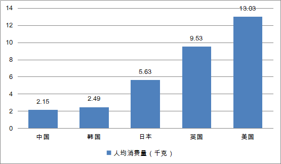 橫向?qū)Ρ任覈c世界其他發(fā)達(dá)國家休閑食品人均消費額、消費量可以發(fā)現(xiàn),盡管近年來中國休閑食品市場增長較快,但與發(fā)達(dá)國家相比仍有不小的差距,增長空間較大。目前,我國休閑食品人均消費量為2.15千克,較為接近韓國的2.49千克,但與日本(5.63千克)、英國(9.53千克)、美國(13.03千克)相比差距仍較大。