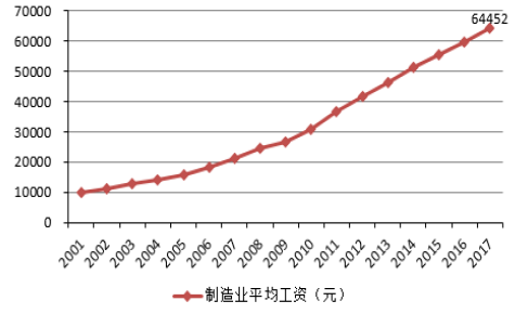 除了未來(lái)勞動(dòng)力不足之外,中國(guó)制造業(yè)員工的平均工資則呈現(xiàn)逐年增長(zhǎng)的態(tài)勢(shì),2017年已升至64452元,同比增長(zhǎng)8.4%。勞動(dòng)力成本不斷上升,用機(jī)器人代替人工也是更加經(jīng)濟(jì)、符合市場(chǎng)規(guī)律的必然選擇。目前,“世界工廠”正不斷的從中國(guó)向東南亞等其他國(guó)家和地區(qū)轉(zhuǎn)移,中國(guó)改革開放初期借助人口紅利快速發(fā)展的條件已然不復(fù)存在。解決勞動(dòng)力不足、勞動(dòng)力成本上升的主要途徑就是智能制造,即生產(chǎn)過(guò)程的自動(dòng)化、智能化產(chǎn)業(yè)升級(jí)。未來(lái)通過(guò)產(chǎn)業(yè)的轉(zhuǎn)型升級(jí)更加注重質(zhì)量和效益的提升,“機(jī)器代人”的生產(chǎn)方式將會(huì)更加普遍。