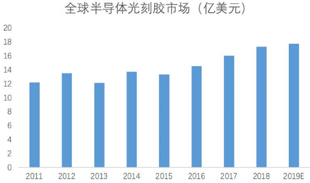 由于半導(dǎo)體光刻膠主要應(yīng)用于半導(dǎo)體制造,故半導(dǎo)體光刻膠市場(chǎng)與對(duì)應(yīng)晶圓廠產(chǎn)能密切相關(guān)。根據(jù)SEMI公布數(shù)據(jù),2018年全球半導(dǎo)體光刻膠市場(chǎng)共17.3億美元,同比增長(zhǎng)2.3%。自2016年來(lái),全球光刻膠市場(chǎng)年均復(fù)合增長(zhǎng)率為9.23%。