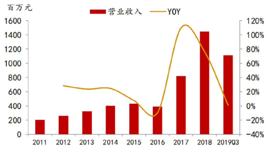 2018年,公司實(shí)現(xiàn)營(yíng)業(yè)收入14.46億元,同比增長(zhǎng)76.23%,實(shí)現(xiàn)歸母凈利潤(rùn)2.84億元,同比增長(zhǎng)239.37%。其中電子化學(xué)品占公司總營(yíng)收的64.9%,是公司最主要的收入來(lái)源。
