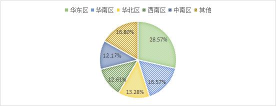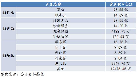 如圖9、10、11是迪安診斷的營業(yè)收入構(gòu)成。按行業(yè)分,營業(yè)收入中,服務業(yè)占比38.42%,商業(yè)占比61.58%;按產(chǎn)品分,營業(yè)收入中,診斷產(chǎn)品占比61.58%,診斷服務占比37.14%,健康體檢占比1.08%,冷鏈物流占比0.20%;按地區(qū)分布,營業(yè)收入中,華東區(qū)、華北區(qū)、西北區(qū)、西南區(qū)、東北區(qū)、其他分別占比為43.87%、25.33%、17.50%、7.43%、2.61%、3.26%。