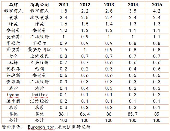 內(nèi)衣作為消費者的第二層“肌膚”,消費者對內(nèi)衣的消費比其他成衣具備更強的忠誠度,進入 21 世紀后,消費者對內(nèi)衣品牌的認可也越來越強。 雖然部分品牌由于品牌老化導致市占率降低,但是總體看,前 16 家女士內(nèi)衣品牌的市場份額從 2011 年的 13.9%提升到了 2015 年的 15%。前八大男士內(nèi)衣品牌的市占率從 5.4%提升到 6%。