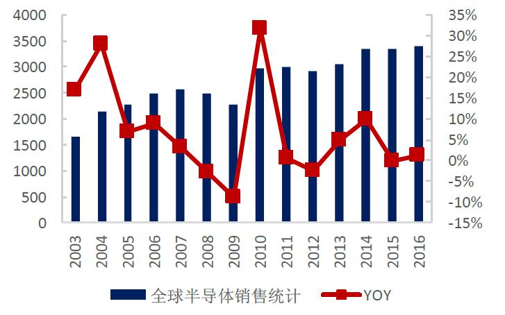 隨著全球經(jīng)濟(jì)的逐步復(fù)蘇,PC、手機(jī)、液晶電視等消費(fèi)類電子產(chǎn)品需求不斷增加,同時在以物聯(lián)網(wǎng)、可穿戴設(shè)備、云計算、大數(shù)據(jù)、新能源、醫(yī)療電子和安防電子等為主的新興應(yīng)用領(lǐng)域強(qiáng)勁需求的帶動下,半導(dǎo)體銷售市場規(guī)模穩(wěn)定增長,預(yù)計2017年全球集成電路市場規(guī)模增長至3465億美元。