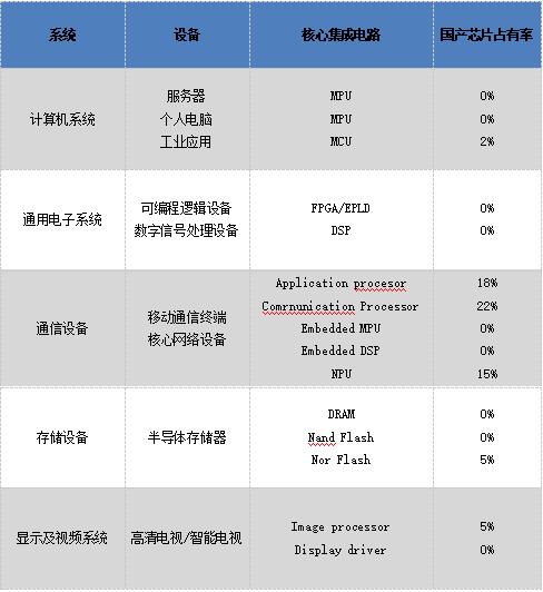 表中計算機(jī)系統(tǒng)中的MPU、通用電子系統(tǒng)中的FPGA/EPLD和DSP、通信裝備中的 Embedded mpu和DSP、存儲設(shè)備中的DRAM和 Nand flash、顯示及視頻系統(tǒng)中的 Display driver,國產(chǎn)芯片占有率都是零這就指出了一個嚴(yán)峻的問題,我國所需核心芯片主要依賴進(jìn)口。半導(dǎo)體產(chǎn)業(yè)關(guān)系國家經(jīng)濟(jì)和安全命脈,中國半導(dǎo)體從業(yè)者身肩重責(zé),必須為核心芯片國產(chǎn)化不斷努力。