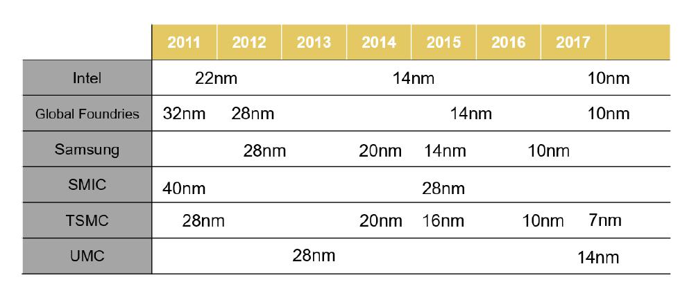 全球領(lǐng)先半導(dǎo)體企業(yè)工藝制程水平