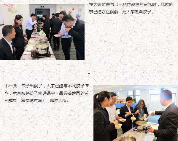 大家分成“愛(ài)吃餃子”“會(huì)做餃子”“多彩生活”和“幸?;▋骸彼膫€(gè)組合,展開(kāi)了包餃子比賽。只見(jiàn)他們熟練的搟面皮、放餡料、捏餃子,十指翻飛之間,剁餡聲、歡笑聲、音樂(lè)聲,交織在一起,每個(gè)人臉上都洋溢著燦爛的笑容,公司里充滿了歡聲笑語(yǔ),匯聚成了一片歡樂(lè)的海洋。